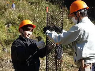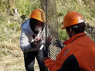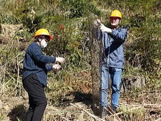 植樹地は、笹被地で、植え穴掘りには苦労しましたが、植栽、シカの防除ネットの装着などを全員手際よく行い、45分ほどで完了しました。参加者は、シカの害から苗木を守る手間やら、山造りには大変な苦労がいるとの感想を述べていましたが、湖畔の素晴らしいロケーションの中でさわやかな汗を流し満足気な様子でした。
