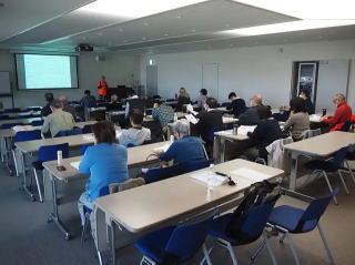 午後は、林業研究所を会場に座学で、地元の青木県議からの激励のメッセージを披露し、GV「森林づくり三重」の池田会長によるチエンソーの安全講習と三重県林業研究所の福本主幹研究員から「シカと森林被害の関係」の講演を受けました。その後、参加団体から3団体の活動状況の報告があり、活発な意見交換が行われ終了しました。